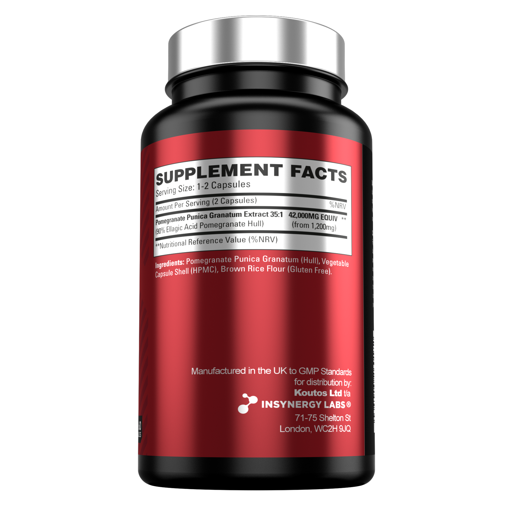 This formula uses a 35:1 extract standardized to 90% ellagic acid. Each 2-capsule serving provides the equivalent of 42,000 mg of raw pomegranate.